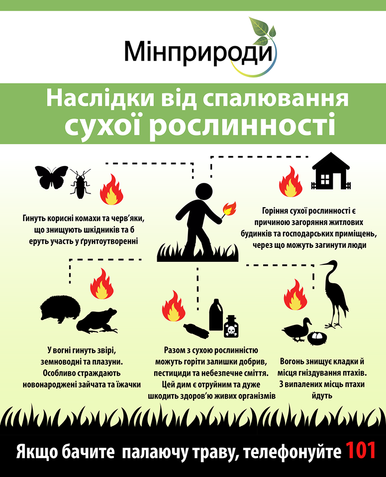 Вогнем знищується не лише сухостій, але й насіння і коріння живих рослин, пошкоджуються нижні частини дерев і кущів, гинуть тварини: комахи, черв’яки, земноводні, плазуни, ссавці. Особливо страждають новонароджені зайчата та їжаки, місця кладки та гніздування птахів. Погіршується якість ґрунтів, що призводить до зниження урожайності. Невинні на перший погляд спалювання можуть призвести до масштабних пожеж, загрожувати знищенням житлових будівель та життю людей. Під час спалювання листя та інших рослинних залишків у повітря вивільняються шкідливі хімічні сполуки, які несуть велику шкоду для здоров’я людини, призводять до захворювань дихальних шляхів, алергічних реакцій.