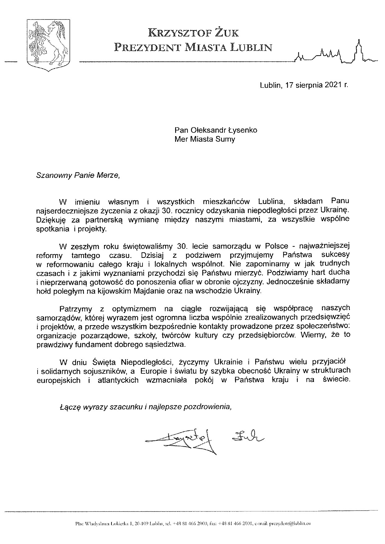 Шановний Пан Голова, Від свого імені та від усіх мешканців міста Любліна вітаю Вас з нагоди 30-ї річниці Незалежності України. Дякую Вам за партнерський обмін між нашими містами, спільні зустрічі та проекти. Минулого року ми святкували 30-річчя місцевого самоврядування в Польщі – найважливішу реформу того часу. Сьогодні, ми радіємо Вашим успіхам у реформуванні своєї країни та місцевих громад. Ми захоплюємося Вашою готовністю і жертовністю захищати Батьківщину та вшановуємо пам'ять тих, хто загинув за незалежність на Майдані і Сході України. Ми з оптимізмом дивимось на нашу співпрацю органів місцевого самоврядування, яка постійно розвивається у нових проектах, громадських зв’язках неурядових організацій, освітніх закладів, діячів культури та мистецтва, приватних підприємців. Ми знаємо, що це справжня основа доброго сусідства. У День Незалежності України бажаємо Вам багато друзів і союзників, бо для Європи і світу присутність України в європейських и атлантичних структурах зміцнить мир у цілому світі! |