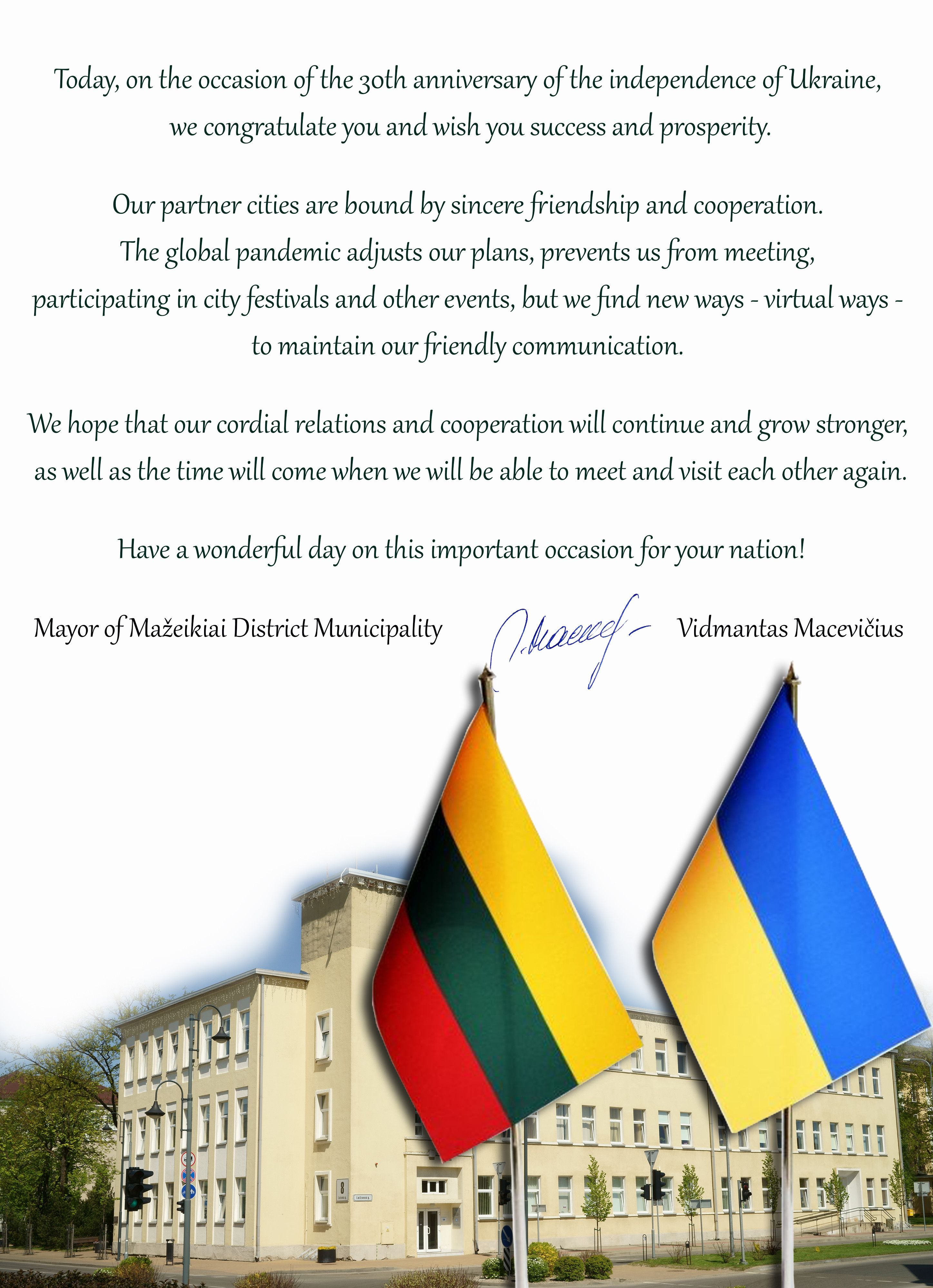 Сьогодні, з нагоди 30 -ї річниці незалежності України, ми вітаємо вас та бажаємо успіхів та процвітання. Наші міста -партнери пов'язані щирою дружбою та співпрацею. Глобальна пандемія коригує наші плани, заважає нам зустрічатися, брати участь у міських фестивалях та інших заходах, але ми знаходимо нові способи - віртуальні способи - підтримувати дружнє спілкування. Ми сподіваємося, що наші сердечні стосунки і співпраця будуть продовжуватися і зміцнюватися, а також настане час, коли ми зможемо знову зустрітися і відвідати один одного. Проведіть чудовий день з цієї важливої нагоди для вашого народу! |