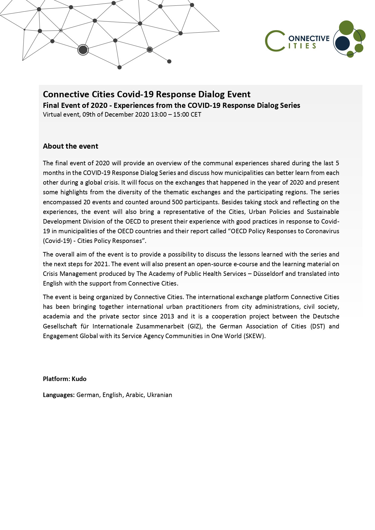 Проєкт Connective Cities разом із муніципальними фахівцями з Німеччини та за кордоном запрошує Вас та Вашу команду взяти участь у Завершальній події 2020 року щодо уроків, отриманих під час пандемії Covid-19.